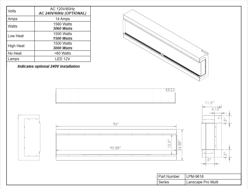 Rated for both indoor and outdoor use, the Modern Flames Landscape Pro Multi-Side Electric Fireplace - 96"can be hardwired into a standard, 120-volt outlet and effortlessly warms your space with its high-efficiency ceramic heater. An optional wall-mounted control panel allows for quick manual operation, while a hand-held remote and Wi-Fi controls let you adjust the flame height, heat output, and lighting from the comfort of your seat.