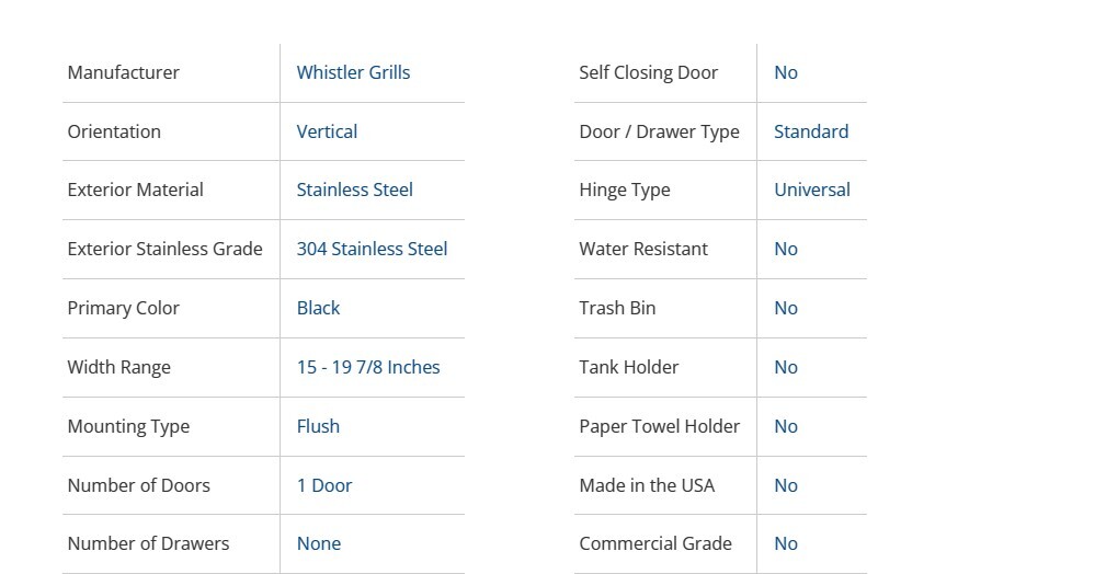 - The Whistler Single Door CBASDV1420-B Black Stainless Steel offers premium outdoor storage with food-grade 304 black stainless steel construction that resists corrosion and weathering. This vertical access door features a soft-close mechanism and sturdy hinges for smooth operation in your outdoor kitchen.