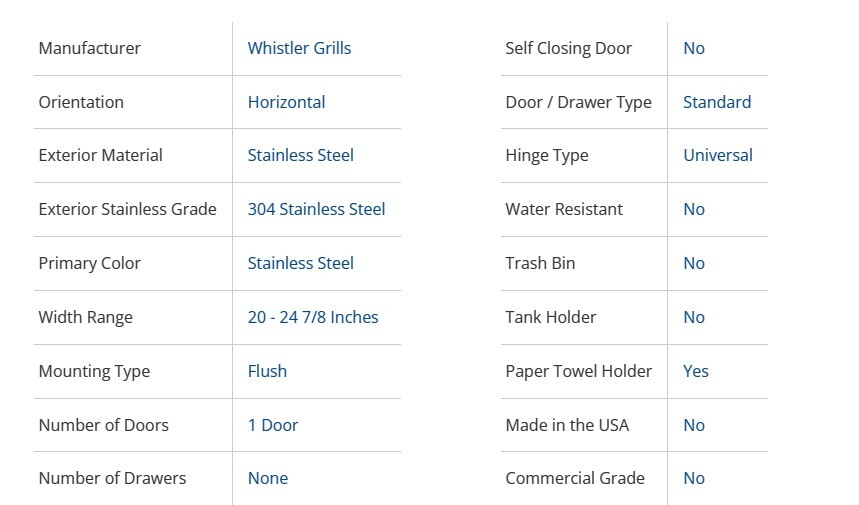 - The Whistler Single Door CBASDH2014-B Black Stainless Steel features a horizontal configuration with hidden hinges for a contemporary, streamlined look. This black stainless door provides weather-resistant access to your outdoor kitchen storage while maintaining visual appeal.