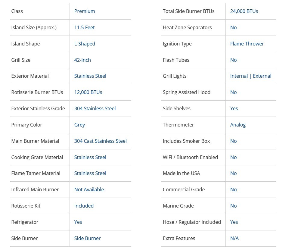 - Fashioned out of premium stainless steel, this Whistler 5-Burner 140 x 61-Inch Gas Grill Island with 90-Degree Corner, Infrared Rear Burner, Refrigerator, Double Side Burner, and Rotisserie Kit is stylish and durable in equal measure. This island boasts an L-shaped design that is ideal for placement in any corner area. On one side of it, you'll find a refrigerator with a backlight and two glass doors. On the opposite side, there is a fully functional and convenient sinksink. In between both sits a generously sized grill as well as an infrared rear burner and a double side burner, finished off by a rotisserie kit.
